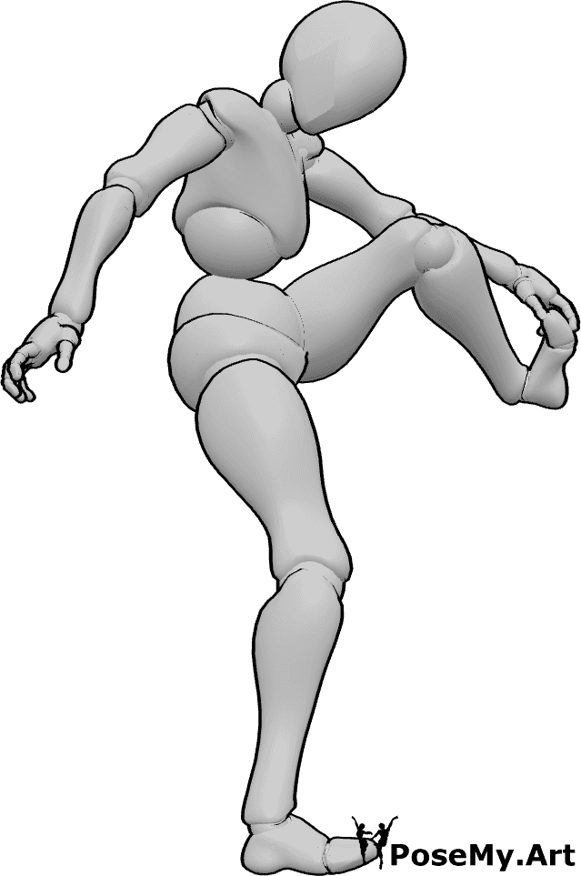Crazy female is standing on one leg and holding her left leg with her left hand