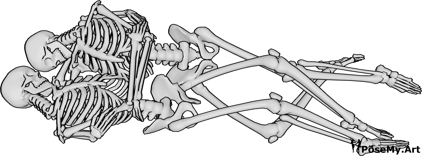 Dead skeleton couple is lying and hugging each other, dead pose reference