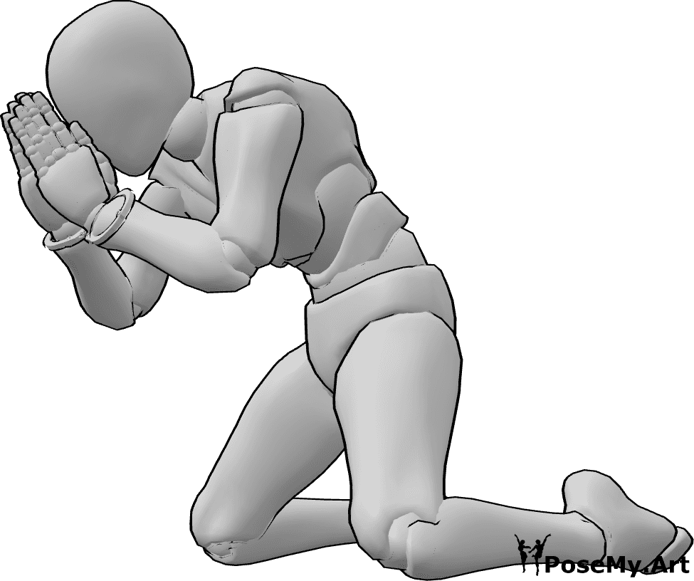 Hombre esposado se arrodilla y reza, pose de hombre esposado