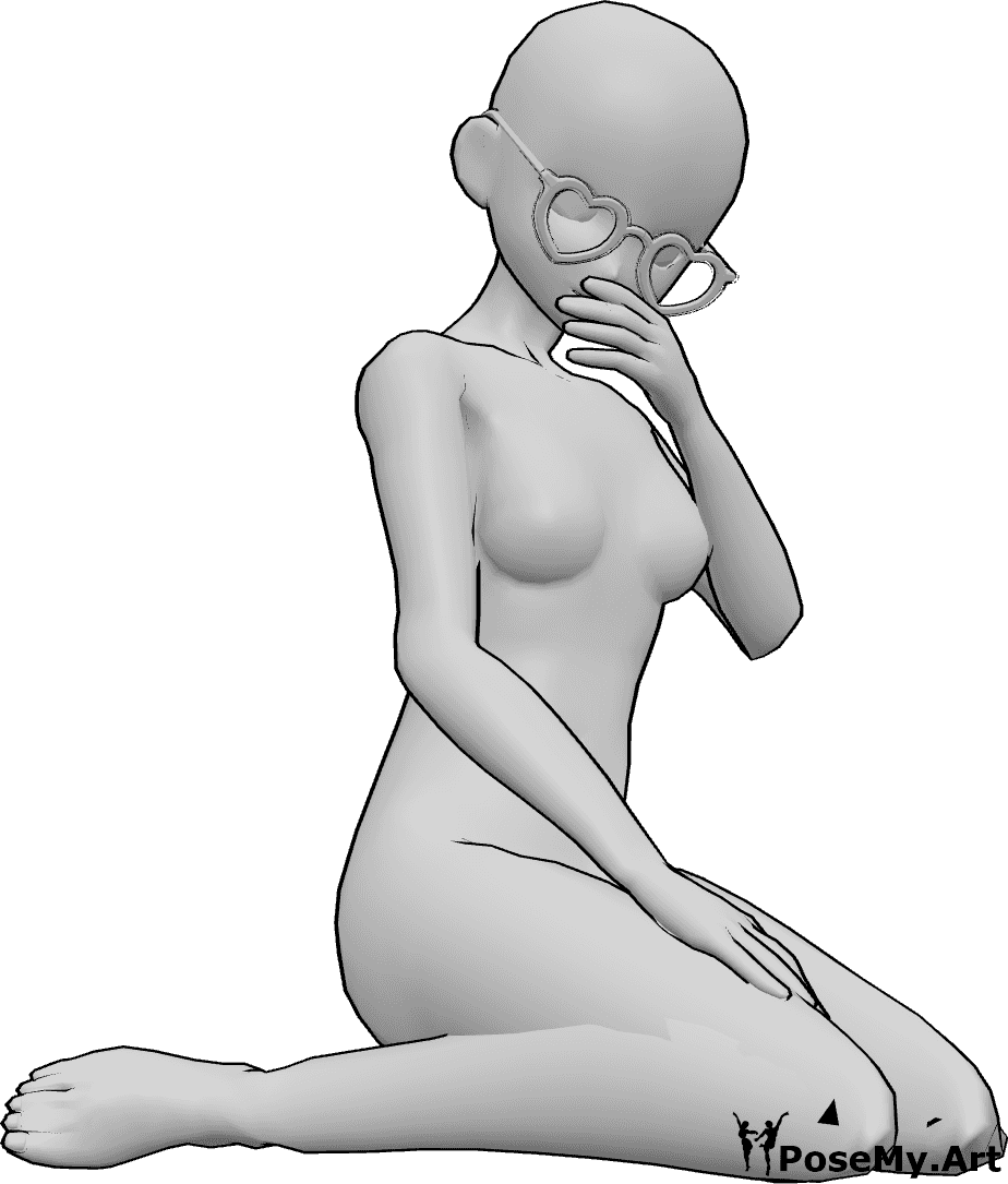 Linda mujer anime arrodillada y riendo, con gafas en forma de corazón