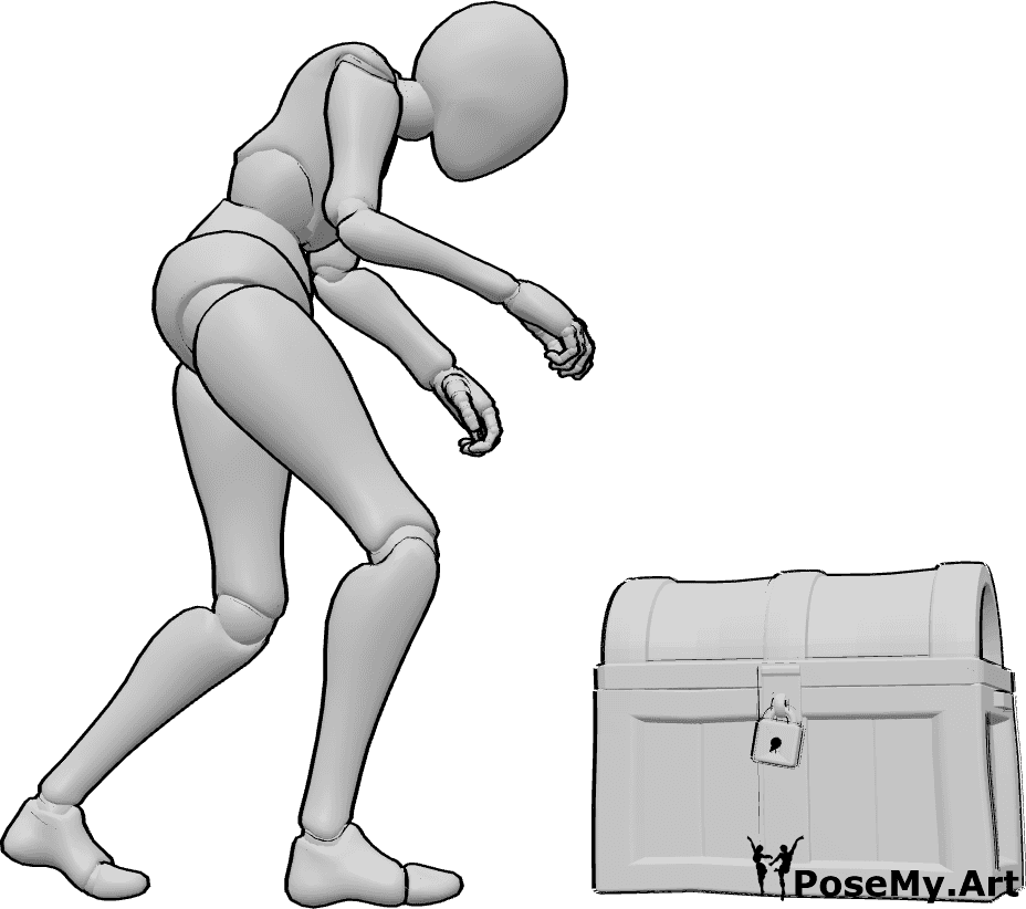 Female thief is sneaking, is about to steal a treasure chest, female thief pose